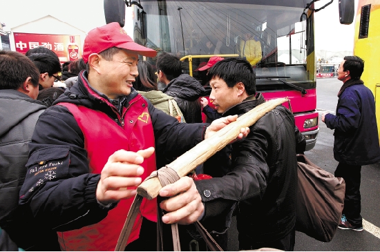 2月15日,身穿红马甲的公交志愿者,正在宁波火车东站公交站上为刚下火车的旅客提供导乘、提行李等服务。 胡建华 潘立娟 摄
