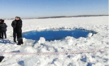 2月15日,俄罗斯警方检查车里雅宾斯克州切巴尔库尔湖上的一处冰洞,疑其为陨石坠落地点。 新华社发