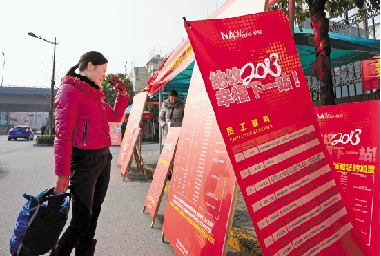2月16日,位于杭州石桥路的天堂经济开发区,不少杭派女装企业早早地在厂房外墙上挂出了巨幅的招工广告,其中待遇最高的缝纫组长岗位,月薪已达万元。 本报记者 董旭明 摄