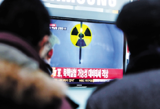 2月12日,在韩国首尔,人们关注电视上播出的有关朝鲜核试验的消息。 新华社发(朴真熙 摄)