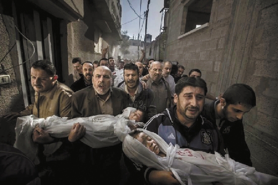 2012年11月20日,加沙城,巴勒斯坦人哀悼一对被以军炸死的年幼兄妹。 瑞典 Paul Hansen 摄
