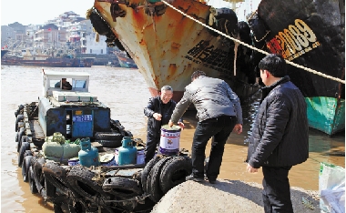 2月16日,温岭石塘渔民将生产生活物资运往渔船,准备出海。 周学军 摄