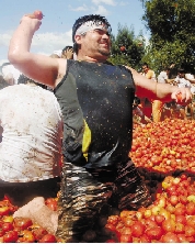 2月16日,在智利南部城市康塞普西翁举行的番茄节上,狂欢的人们参加番茄大战。 新华社发
