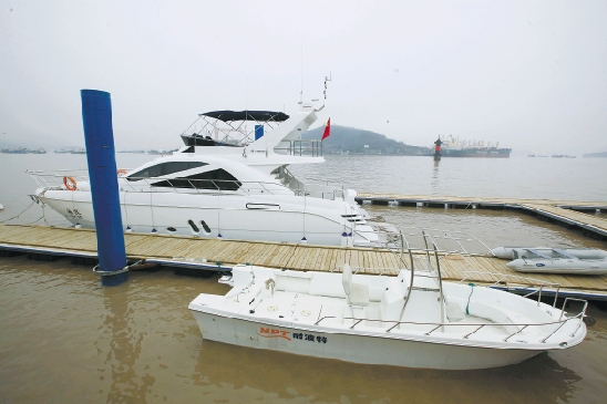 2月18日,定海海滨公园东侧,“海牧”等3艘游艇正停泊刚建成的浮动游艇码头边。据了解,该游艇码头通过栈桥连接海滨公园观光平台,为游客提供游艇自驾、垂钓、观光等海上旅游项目。 陈炳群 摄
