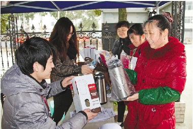 2月18日,永嘉美莉达装饰扣有限公司门口,前来报到的员工都收到了企业发放的礼品。正月十二前复工的员工,均有500元奖励。 叶圣义 摄