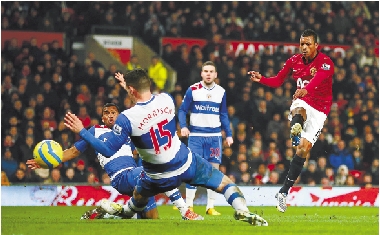 2月18日,曼联队球员纳尼(右)射门得分。当日,在英格兰足总杯第五轮比赛中,曼彻斯特联队主场以2比1战胜雷丁队,晋级八强。 新华社发