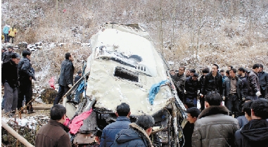 2月19日,救援人员在车祸现场施救。当日11时许,一辆中巴车途经湖北省建始县官店镇青树岭时坠下百米岩坎,7人当场死亡,12人受伤被送往医院抢救。截至16时,死亡人数上升至9人,其余10名伤员仍在抢救中。 新华社发