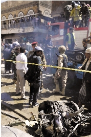 2月19日,在也门首都萨那,警察封锁坠机现场。也门安全官员称,一架军用飞机当日在首都萨那市中心坠毁,造成至少9人死亡,23人受伤。