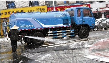 萧山环卫工人用洒水车清除路面积雪,确保车辆、行人安全。 傅灿良 摄