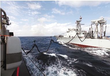 2月20日,中国海军第十四批护航编队在南海某海域顺利实施首次横向液货补给,图为综合补给舰微山湖舰(右)在南海某海域为导弹驱逐舰哈尔滨舰实行液货补给。 新华社记者 饶饶 摄