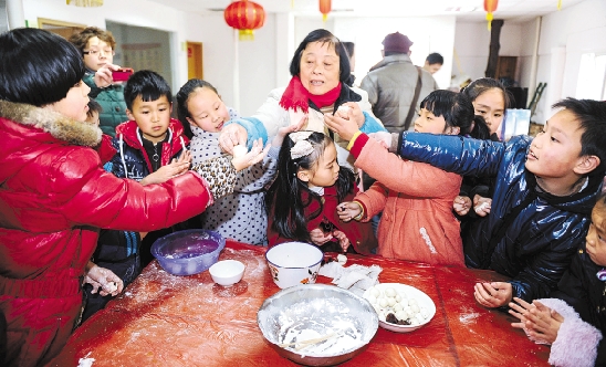 2月20日,杭州下马塍社区的孩子们在家长的带领下一起包汤圆,迎接即将到来的元宵节。 新华社发