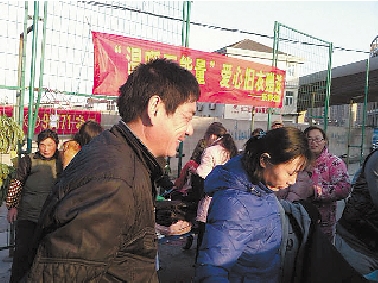 去年12月,乐邦公益志愿者向农民工捐赠衣物。