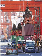 日本财务省2月20日公布的速报值显示,1月份日本贸易收支出现1.6294万亿日元(约合174亿美元)逆差,创1979年1月有比较统计以来单月最大逆差额。这是日本连续7个月出现贸易逆差。图为卡车在日本东京的码头装货。 新华社发