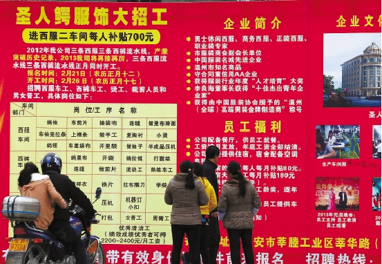 2月20日,瑞安市莘塍工业区竖起大型招聘广告牌,打“感情牌”来缓解用工荒。 庄颖昶 摄
