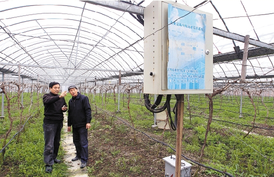 | 2月22日,在嘉兴市南湖区大桥镇,省农科院的徐庆松(左)正指导农户何关林使用“农业物联网技术”。通过这个技术,农户只要发条短信,就可以对葡萄大棚内的空气温湿度、土壤水分含量等进行实时检测。 通讯员 杨懿泓 记者 吴煌 陈培华 摄 |