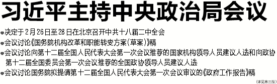 ●决定于2月26日至28日在北京召开中共十八届二中全会