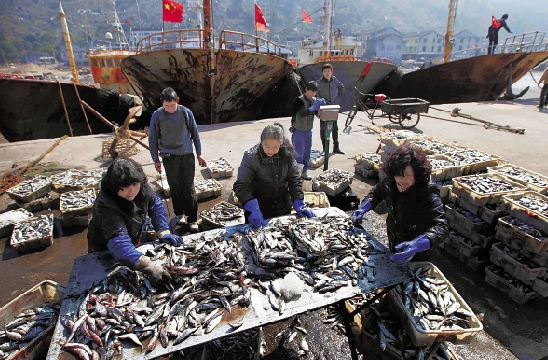 2月23日,在苍南县舥艚渔港码头,开春出海“第一捕”的渔船满载而归,妇女们忙着分拣鱼货。