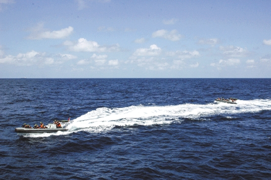2月24日,参加演练的中国海军第十三批护航编队临检组战士乘快艇前往商船。当日,中国海军第十三批护航编队战士利用护航契机,派临检组战士登临一艘配合演练的中国香港籍商船,并成功完成远海临检拿捕演练。 新华社记者 朱绍斌 摄