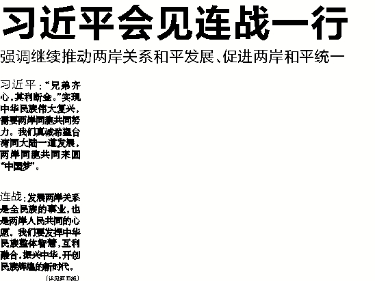习近平:“兄弟齐心,其利断金。”实现中华民族伟大复兴,需要两岸同胞共同努力。我们真诚希望台湾同大陆一道发展,两岸同胞共同来圆“中国梦”。