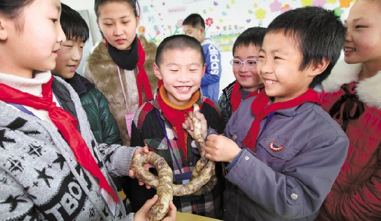 2月26日,诸暨市三都小学开学后,来自全国各地的民工子弟晒出家乡的美食特产——贵州熏肉、四川腊肠、湖南粉条、江西茄子干等,让同学们了解到各地的民俗风情。 诸暨日报记者 郭斌 通讯员 许瑛 摄