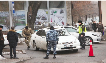 2月26日,在哈萨克斯坦最大城市阿拉木图,哈安全部门对进入各国代表团驻地的车辆进行安检。 新华社发
