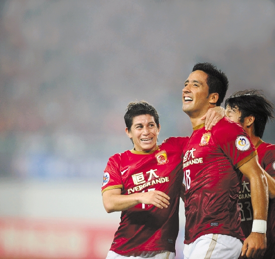 上图为广州恒大队球员巴里奥斯(中)进球后接受队友孔卡的祝贺。 新华社发