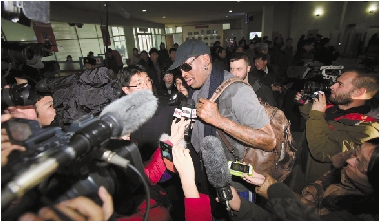 2月26日,美国全国篮球协会(NBA)代表团开始对朝鲜进行为期一周的访问。图为美国NBA退役球员罗德曼(中)在抵达平壤机场后接受记者采访。 新华社发