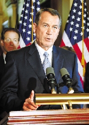 2月25日,美国众议院议长约翰·博纳同其他共和党高层在华盛顿举行新闻发布会。博纳当日表示,总统奥巴马应与参议院达成共识,以便避免3月1日自动启动本财年(截至2013年9月底)约850亿美元的政府开支削减计划。 新华社发