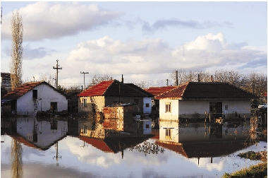 2月26日,在距马其顿首都斯科普里约60公里的小镇圣尼古莱,房屋被洪水包围。由于持续大雨造成的洪水已造成1人死亡,数百房屋遭洪水浸没。 新华社发