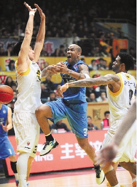 2月27日,CBA季后赛首轮第一回合比赛中,浙江广厦队主场96比110不敌北京金隅队。图为北京金隅队球员马布里(中)在比赛中突破上篮。 新华社发