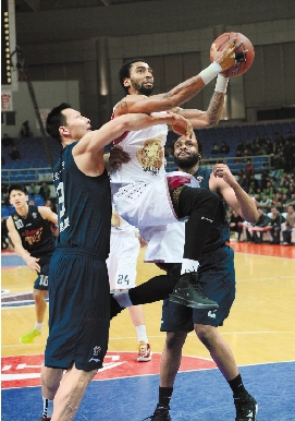 2月27日,CBA季后赛首轮第一回合比赛中,浙江稠州银行队主场89比104负于广东东莞银行队。图为稠州银行队的杜比(中)在上篮。 记者 潘良干 摄