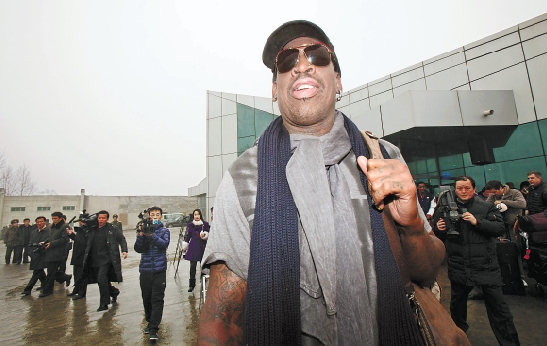 2月26日,美国NBA退役球员罗德曼抵达平壤顺安机场。 新华社记者 张利 摄