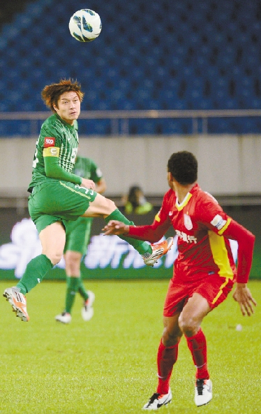 图为杭州绿城队队员汪嵩(左)在与长春亚泰队队员争头球。