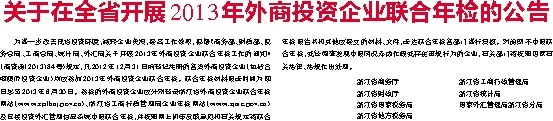 为进一步改善我省投资环境,减轻企业负担,提高工作效率,根据《商务部、财政部、税务总局、工商总局、统计局、外汇局关于开展2013年外商投资企业联合年检工作的通知》(商资函〔2013〕84号)规定,凡2012年12月31日前登记注册的各类外商投资企业(包括台港澳侨投资企业)均应参加2013年外商投资企业联合年检。联合年检材料报送时间为即日起至2013年6月30日。参检的外商投资企业应分别登录浙江省外商投资企业联合年检网站(www.zjslhnj.gov.cn)、浙江省工商行政管理局企业年检网站(www.zjaic.gov.cn)及直接投资外汇管理信息系统申报联合年检,并按照网上初审反馈意见和有关规定将联合年检报告书和其他应提交的材料、文件,送达联合年检各部门进行复核。对逾期不申报联合年检,或经调查发现申报情况弄虚作假或存在违规行为的企业,有关部门将按照国家有关法律、法规作出处理。