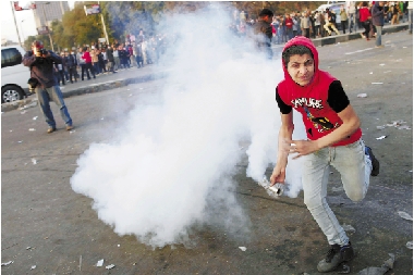 3月9日,在埃及首都开罗,一名抗议示威者手持催泪弹。 新华社发