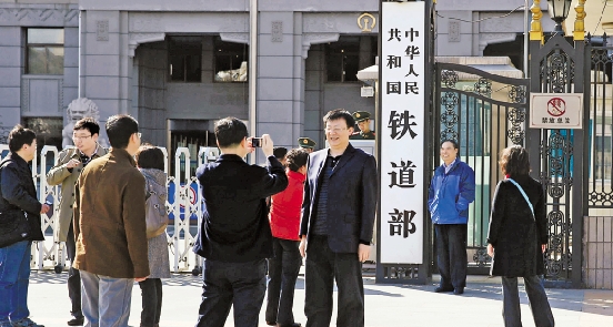 3月10日,人们在铁道部前留影。根据3月10日提请全国人大会议审议的《国务院机构改革和职能转变方案》,将不再保留铁道部,实行铁路政企分开。