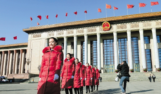 3月10日上午,一位外国记者正聚焦两会工作人员。
