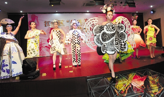 青花瓷、马赛克、大荷花,近日,杭州采荷第二幼儿园老师展示用废纸制作的环保时装秀。在江干区妇联举办的“传递美感,传承历史”风尚秀活动中,有12支队伍展示了各自区域有特色的历史民俗文化。 本报记者 叶寒青 通讯员 王喆健 摄