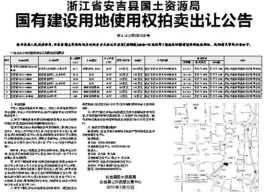 四、本次拍卖出让的详细资料和具体要求,见《拍卖出让文件》。申请人可于2013年3月12日至2013年4月1日,到安吉县公共资源交易中心(安吉县递铺镇玉华路23号工商银行三楼)获取拍卖出让文件,并提交书面申请,交纳竞买保证金的截止时间为2013年4月1日下午3时(以银行到账为准)。