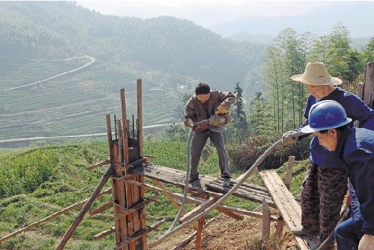在国家级生态乡龙游县大街乡新槽村,几位农民正在建造观光亭。该村去年投入近10万元,发动农民改造荒山梯田,在300亩山地上种上了油菜花。春天来了,山坡将披上一片金黄,成为山村胜景。这几天,村民正加紧建造两个观光亭,准备迎接进山观景的游客和摄影家。 本报记者 徐斌 摄 |
