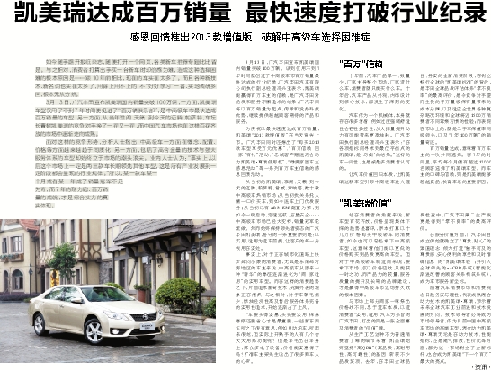 凯美瑞达成百万销量 最快速度打破行业纪录