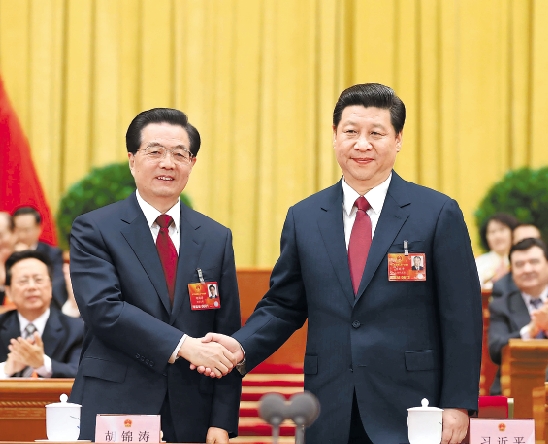 3月14日,十二届全国人大一次会议在北京人民大会堂举行第四次全体会议。习近平当选中华人民共和国主席、中华人民共和国中央军事委员会主席。这是习近平当选后,胡锦涛与习近平亲切握手。 新华社记者 兰红光 摄