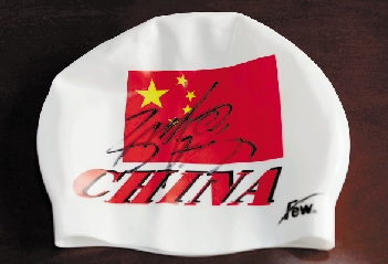 奥运冠军孙杨、叶诗文捐出了自己的签名泳帽。 记者 潘良干 摄