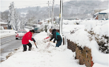 3月23日,在英国威尔士北部弗林特郡的莫尔德附近,人们清理路面积雪。