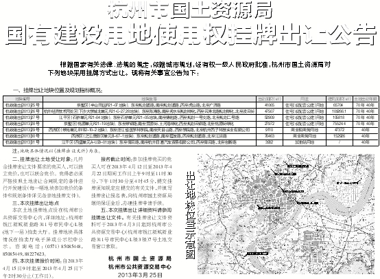 五、本次挂牌出让详细资料请参阅挂牌出让文件。有关挂牌出让文件资料可于2013年4月3日起到杭州市公共资源交易中心(杭州市钱江新城新业路311号市民中心L楼3楼)7号土地交易窗口索取。
