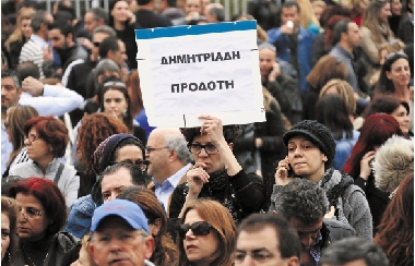 3月26日,在塞浦路斯首都尼科西亚,一名塞浦路斯银行员工参加集会时手举写有“叛徒季米特里亚季斯”字样的标语,要求塞浦路斯央行行长季米特里亚季斯辞职。当天,塞浦路斯银行员工及数千名学生举行集会,抗议欧元集团批准的救助协议损害他们的切身利益,并反对正在进行的银行业改革。根据塞浦路斯政府25日与欧盟和国际货币基金组织达成的救助协议,塞浦路斯银行中10万欧元以上的存款则将面临“减记”的命运,最高可能将达40%。 新华社发 |