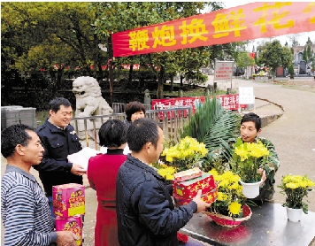 随着清明节的临近,武义县壶山陵园推出鞭炮换鲜花公益活动。