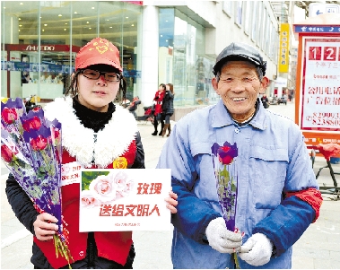 同济大学浙江学院志愿者向路人讲解文明出行的知识,并将手中的鲜花送给文明出行的路人。