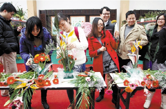 春回大地。嘉善县大云镇一家农庄里,游客正进行DIY插花比赛。DIY插花比赛是该农庄最受游客喜爱的一个旅游项目。 嘉善报道组 刘文书 通讯员 胡凌翔 摄
