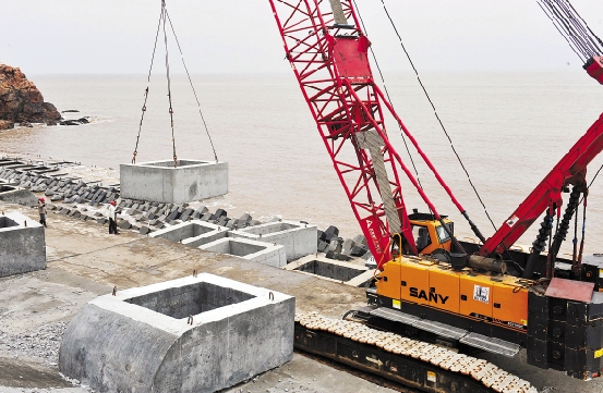 4月1日上午,一块28吨重的沉箱被缓缓地吊装到舟山岱山县栲门大坝迎海侧面,大坝除险加固工程正在紧锣密鼓进行。该大坝全长450米,始建于1974年,是一座堵港促淤大坝。此次加固将安放沉箱300多个。 沈磊 摄
